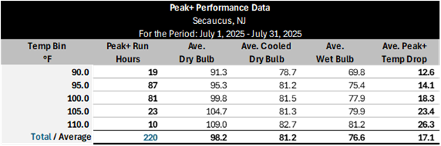 The table below shows summary temperature data by 5-degree temp. bins for July 2025 as well as average Dry Bulb & Wet bulb temps at those bins. The “Ave. Dry Bulb” is the ambient air temperature around the unit, and the “Ave. Cooled Dry Bulb” is the air temperature after being cooled by the Peak+ System (the temperature of the air entering the HVAC Coils). The “Ave. Peak+ Temp Drop” shows the cooling effect of Peak+.