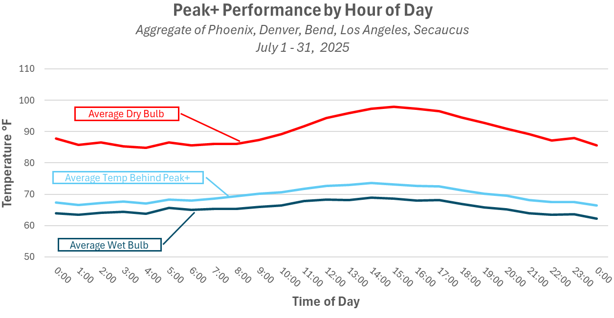 The table below shows summary temperature data for July 2025 aggregated across all the sites included in this analysis as well as average Dry Bulb & Wet bulb temps at those bins. The “Ave. Dry Bulb” is the ambient air temperature around the unit, and the “Ave. Cooled Dry Bulb” is the air temperature after being cooled by the Peak+ System (the temperature of the air entering the HVAC coils). The “Ave. Peak+ Temp Drop” shows the cooling effect of Peak+.